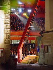 Die Tribüne verleiht dem Spielort ein einmaliges, unverkennbares Profil. Außergewöhnliche Ein- und Ausblicke auf die wunderschöne Altstadt und perfekte Sicht auf die Bühne bereiten 600 Besucher auch bei Schlechtwetter ungetrübtes Theatervergnügen.